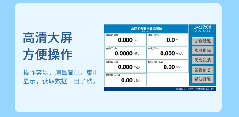 多參數水質分析儀是本公司自主研發制造的新一代飲用水水質監測設備,該設備可廣泛用于自來水、地表水、地下水、水源水、飲用水、江水、河道、海洋、污水排放口等不同水體的水質在線監測。多參數水質分析儀監測參數包括溫度、pH、ORP、電導率、溶解氧、濁度、濁度和余氯等。可根據客戶需要,增加或減少監測參數。CN1