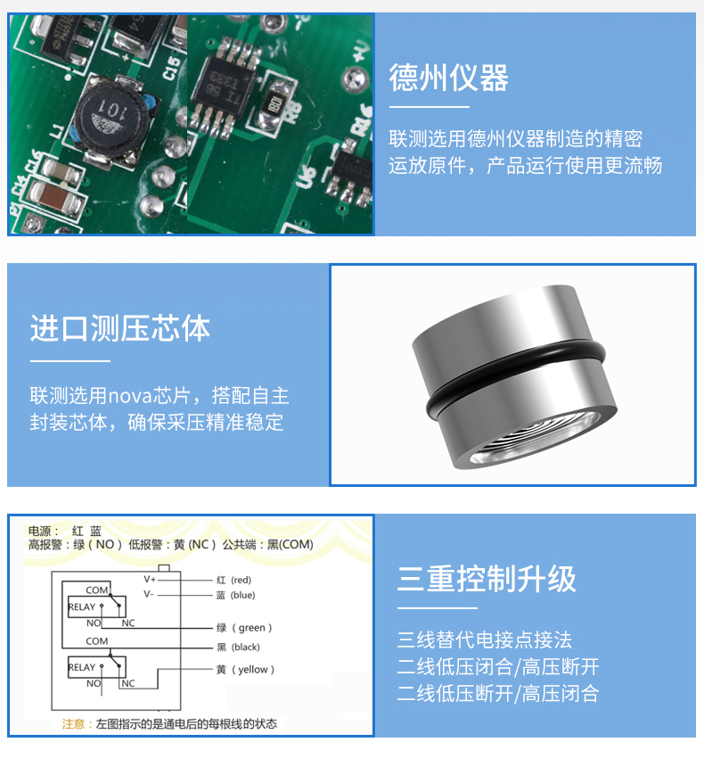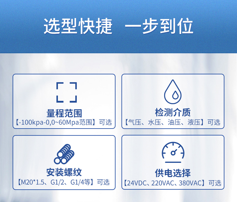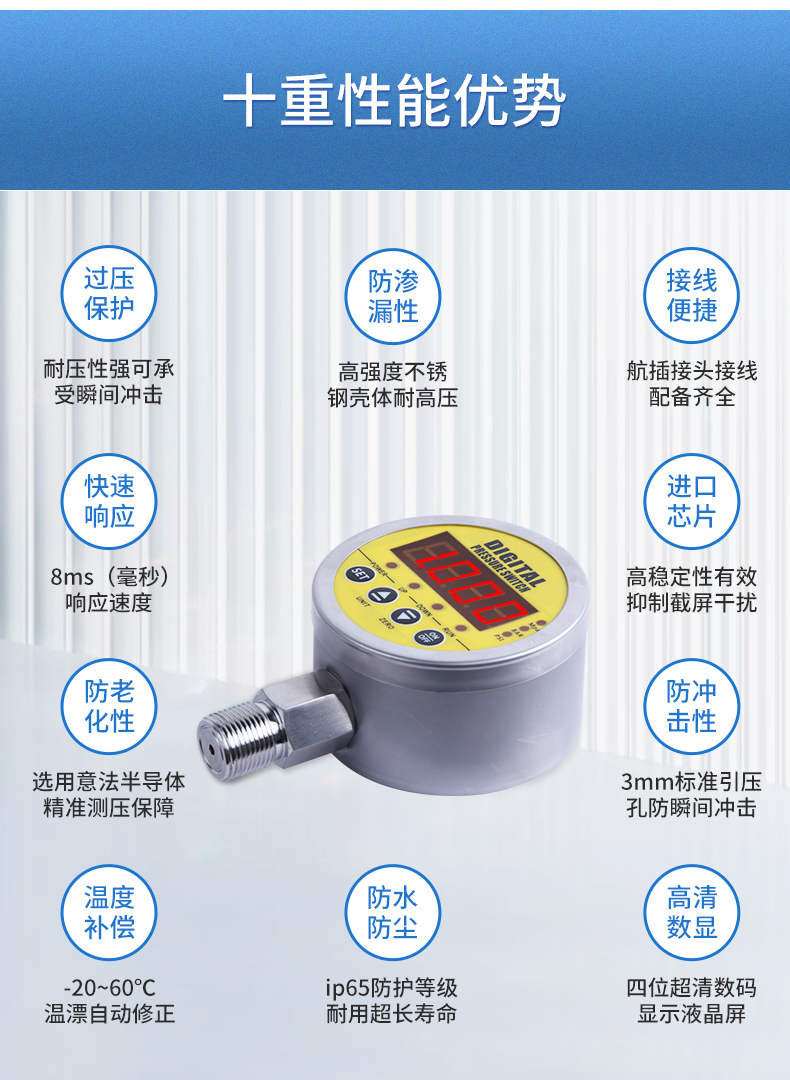 數顯壓力開關設計為控制油壓、氣壓、水壓的兩路獨立的壓力監控。并輔以報警方式選擇、密碼保護,延時報警、誤差清零、采樣速率可調等功能,使該產品更準確更智能的實現壓力報警和控制。