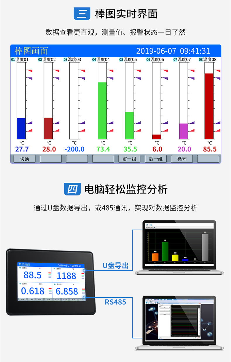 SIN-R7000C觸摸超薄無紙記錄儀采用新型大規模集成電路,對輸入、輸出、電源、信號采取可靠保護和強抗干擾設計。8路萬能信號輸入(可組態選擇輸入:標準電壓、標準電流、熱電偶、熱電阻、毫伏等)??蓭?路報警輸出,1個饋電輸出,RS485通訊接口,以太網接口,微型打印機接口和USB接口,SD卡插座;具有強大的顯示功能,實時曲線顯示,歷史曲線追憶,棒圖顯示,報警狀態顯示。