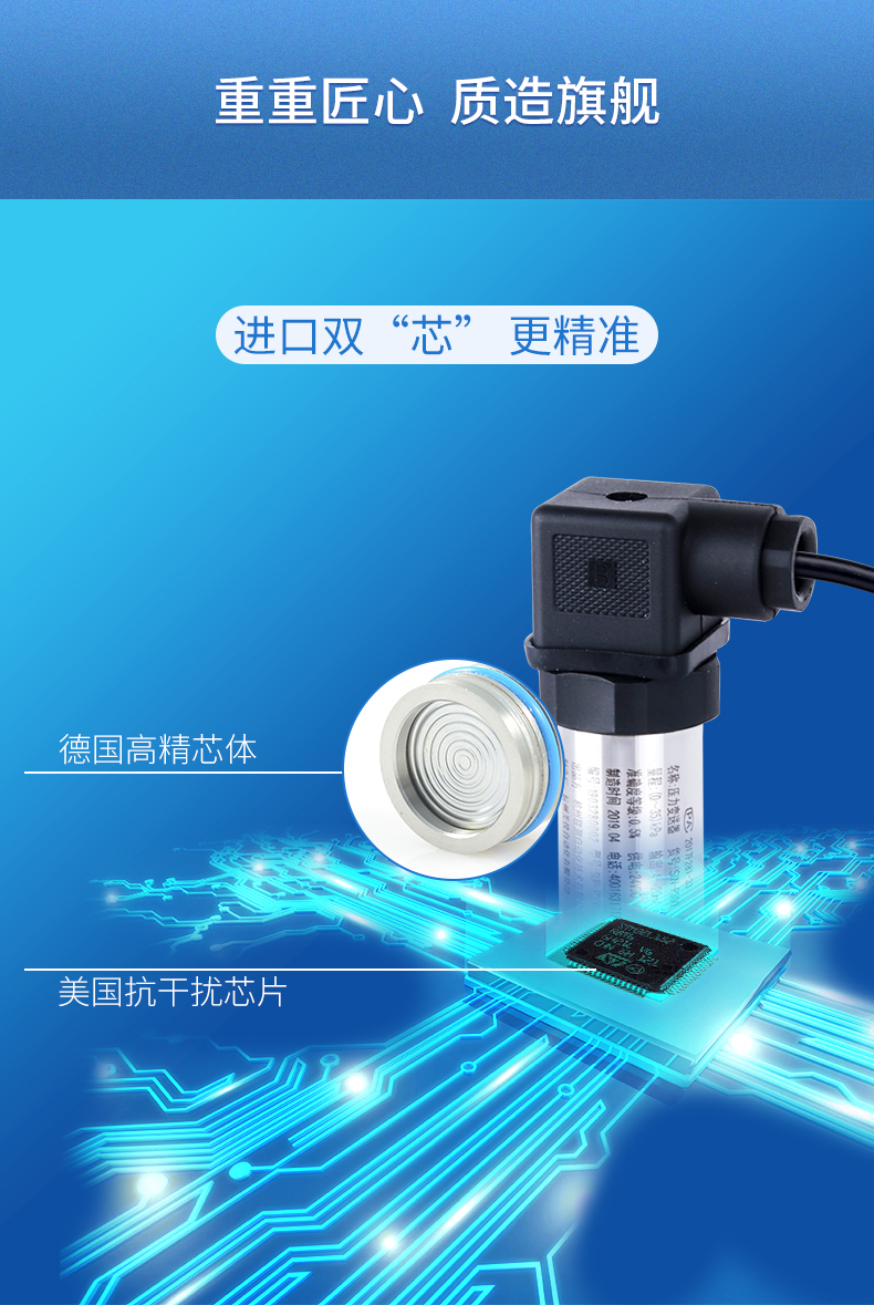 擴散硅壓力變送器選用進口高精度、高穩定性壓力 敏感芯片。敏感芯片采用先進的微機械刻蝕加工工藝, 通過在硅片上擴散四個高精度電阻,從而形成惠斯通電 橋。由于壓阻效應,四個橋臂電阻的阻值發生變化,電 橋失衡,敏感元件輸出一個對應壓力變化的電信號。輸 出的電信號通過放大和非線性矯正電路的補償,產生與 輸入壓力成線性對應關系的電壓、電流信號。CN8